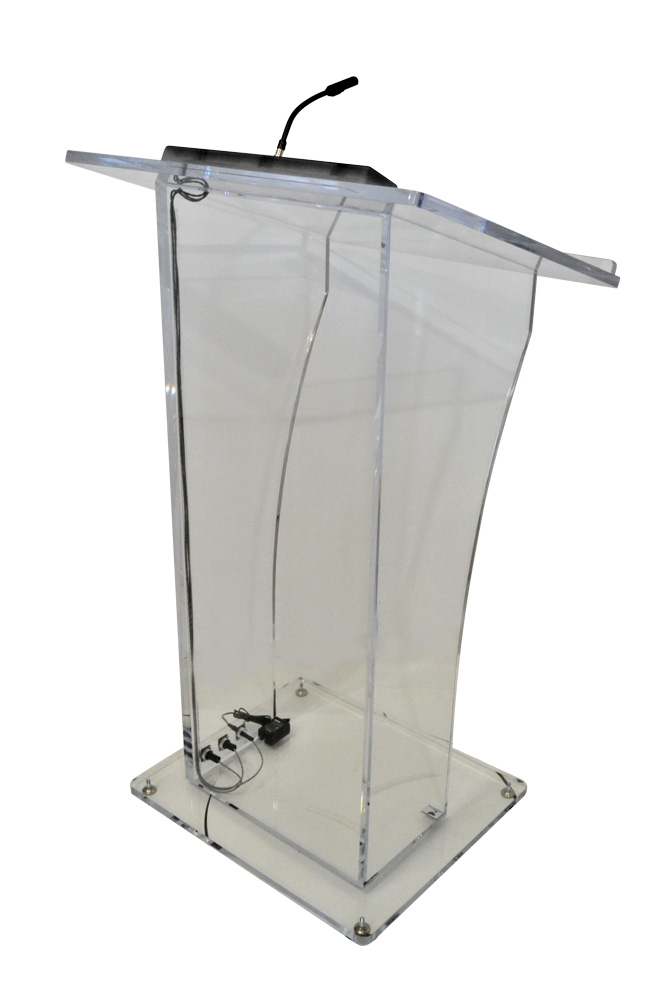 Acrylic lecterns are a stylish and elegant addition to any speaking engagement. Our designs are suitable for churches, award shows, and gala presentations. A/V components are concealed neatly so that they do not detract from the lectern itself. Made of high quality North American acrylic, these are sure to complement a beautifully dressed speaker on stage.