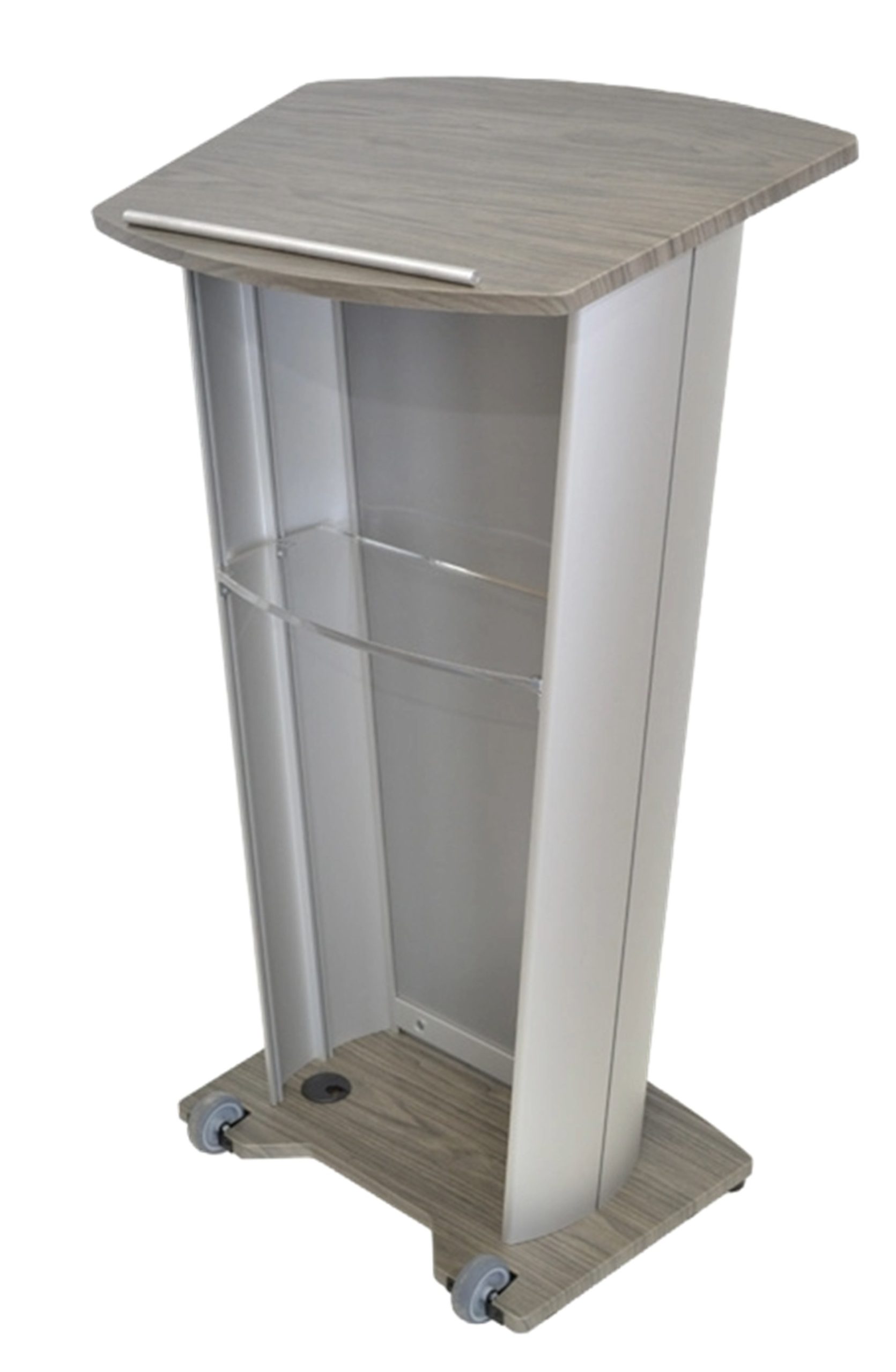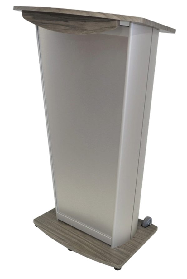 The VH1 is equipped with tilt-back casters (wheels on the base) for easy maneuverability, a water shelf for beverage and small item storage, and a paper stop to keep documents secured on the speaking surface.